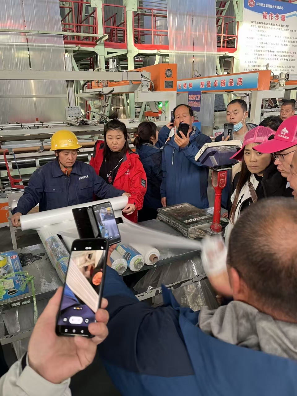 在集團領導和公司銷售、技術人員的帶領下,考察團參觀了功能棚膜車間、地膜車間、技術研發中心、展廳等處??苽愃軜I先進的集中棚膜供料設備、智能化地膜自動卷取系統、一流的檢驗檢測儀器受到廣大客商的高度關注和充分肯定。